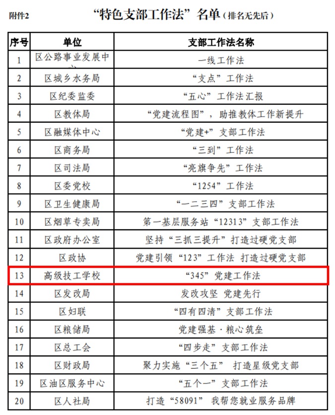 此次创建活动,全区申报“一机关一品牌”63项、“一支部一特色(工作法)”86项,经过文本初审、综合评定、汇报展示等环节,20个工作法获“特色支部工作法”称号。