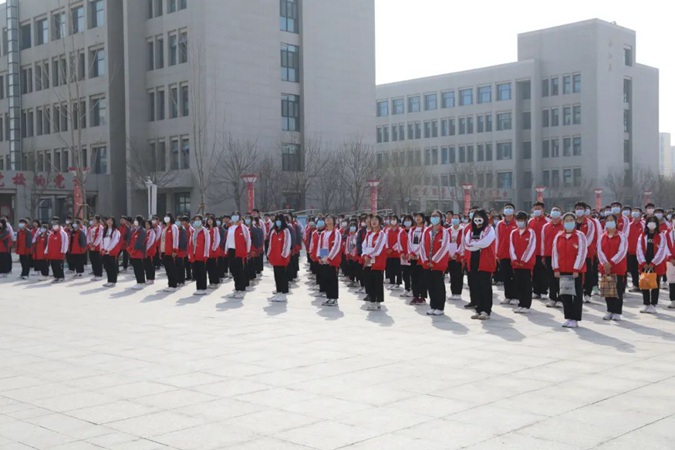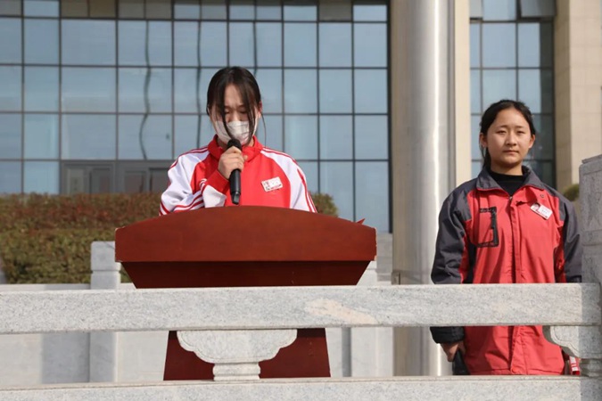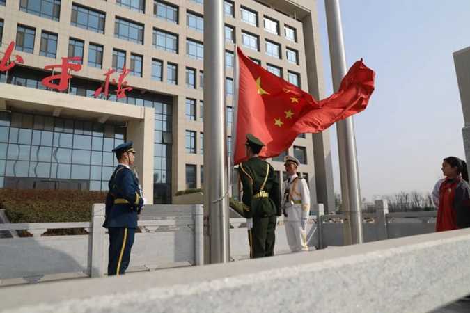 迎着初春的朝阳,国旗队迈着整齐划一的步伐来到国旗台下。在嘹亮的国歌声中,升旗手振臂一挥,鲜艳的五星红旗随风飘展,在全体师生的注视下冉冉升起。