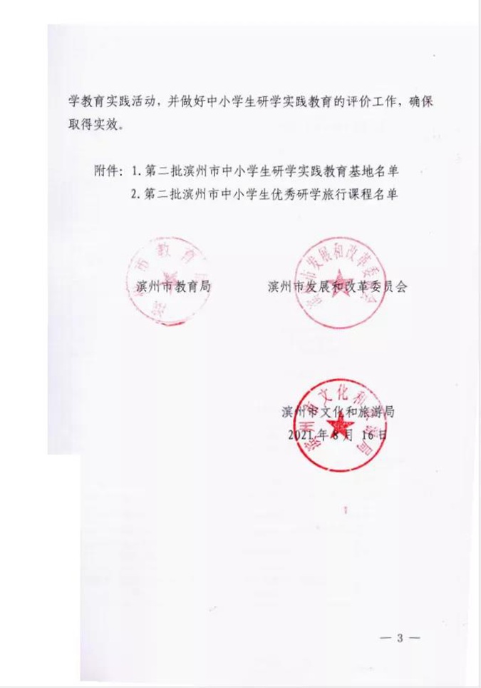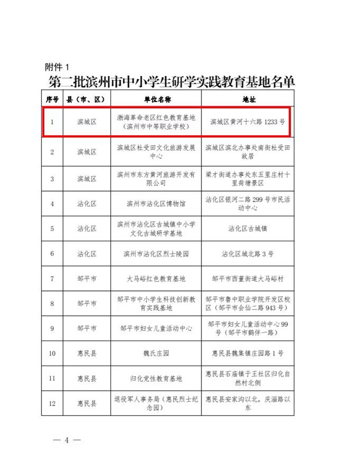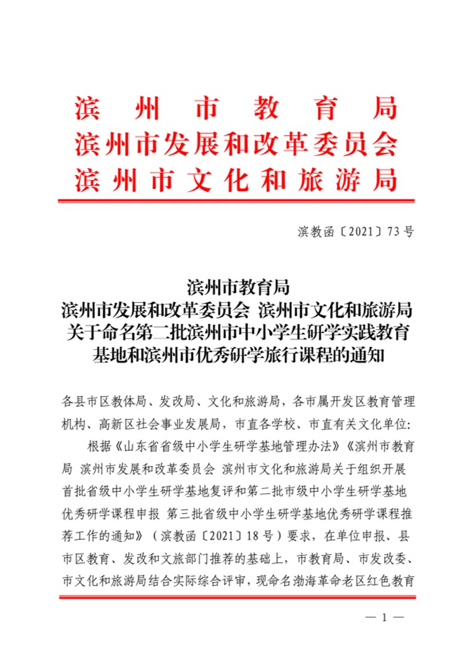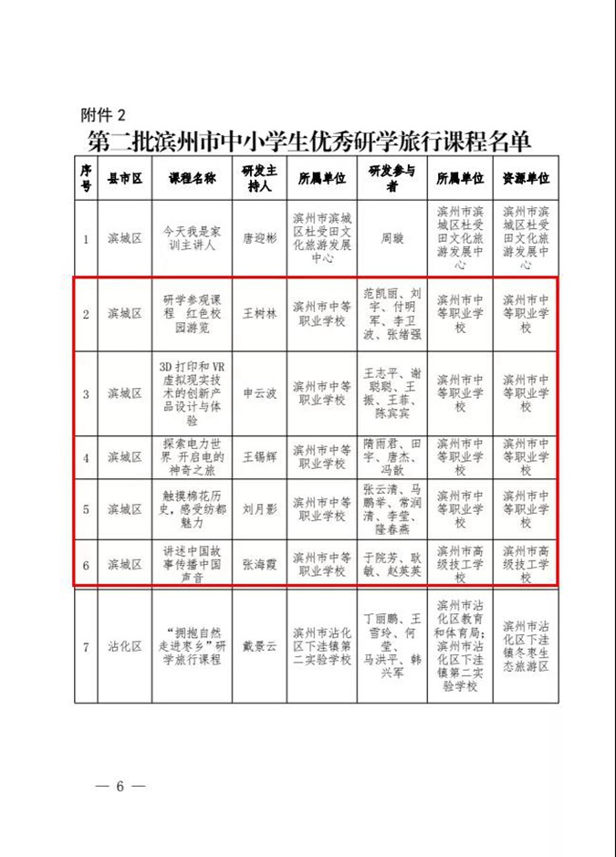 近日,滨州市教育局、滨州市发展和改革委员会、滨州市文化和旅游局联合印发《关于命名第二批滨州市中小学研学实践教育基地和滨州市优秀研学旅行课程的通知》,滨州市中等职业学校(滨州市高级技工学校)被评为滨州市中小学生研学实践教育基地;党委书记、校长王树林主持研发的课程《研学参观课程 红色校园游览》等5个课程被评为滨州市中小学生优秀研学旅行课程,占全市第二批中小学生优秀研学旅行课程的五分之一。