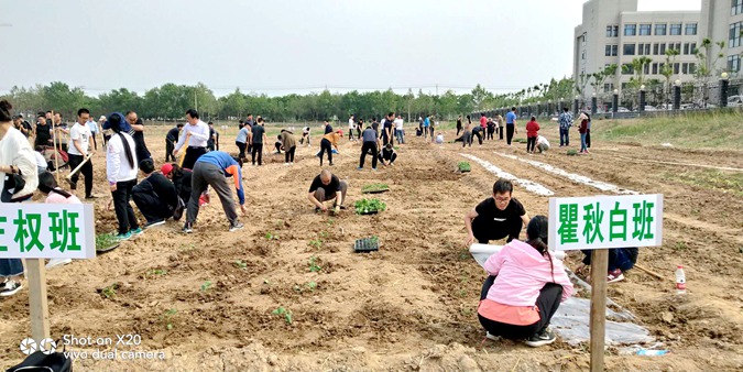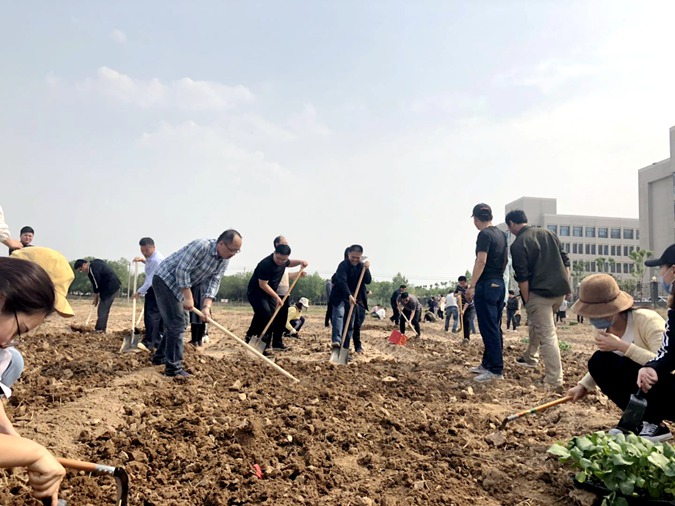 “往年的南泥湾处处是荒山,没呀人烟;如今的南泥湾与往年不一般,不呀一般;如呀今的南泥湾,与呀往年不一般,再不是旧模样,是陕北的好江南……”一曲《南泥湾》,曾唱响了祖国大江南北,那种“自力更生,奋发图强”的可贵精神,激励着一代又一代中华儿女战胜困难,夺取胜利。5月10日下午,滨州市高级技工学校220余名教职工掀起了“南泥湾大生产运动”,翻地、拔草、栽种、施肥、覆膜、浇水,全过程参与,亲身体验了一把“农民”角色。种植的蔬菜更是“五花八门”,有茄子、辣椒、西红柿,也有丝瓜、黄瓜、苦瓜等藤蔓蔬菜,老师们将一盘盘小苗种成了一畦畦,深褐色的土地焕发了生机。