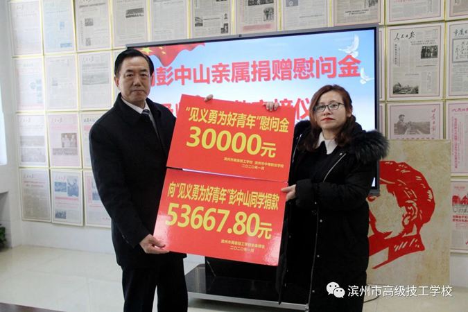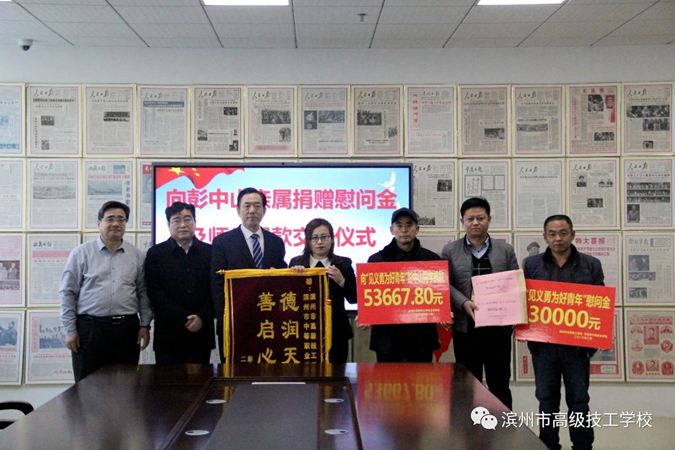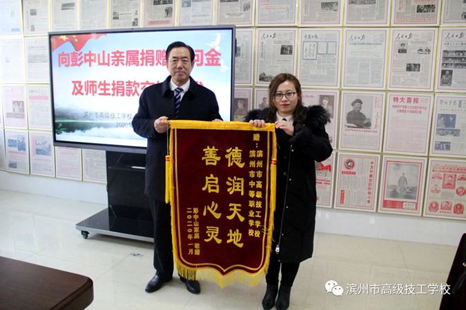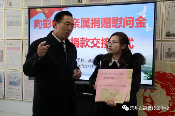 2020年1月10日,滨州市高级技工学校举行向彭中山亲属捐赠慰问金及师生捐款交接仪式。学校党委书记、校长王树林,党委委员、副校长刘岳,党委委员、纪委书记、市纪委监委监察专员宋志刚参加。彭中山同学的亲属满怀感激之情,将绣有“善启心灵、德润天地”字样的锦旗送给学校,以此感谢学校对彭中山家庭的关爱和帮助。