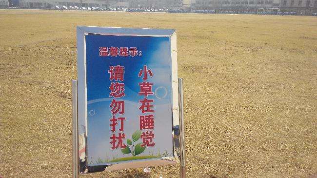 学校设置提示牌,温馨提示学生爱护花草,勿进入踩踏。自实施草皮养护返青以来,没有学生再进入操场嬉戏,充分体现了我校学生素养的整体提升。