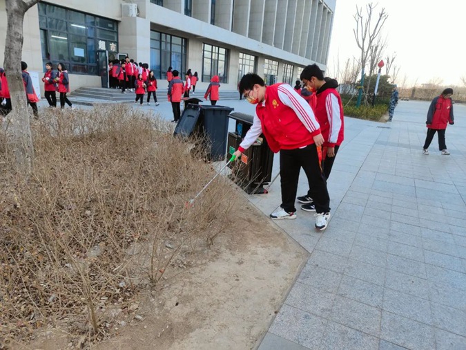 启动仪式结束后,学生穿上红马甲,对校园内路面、绿化带、草坪等各处的卫生死角进行了清理。