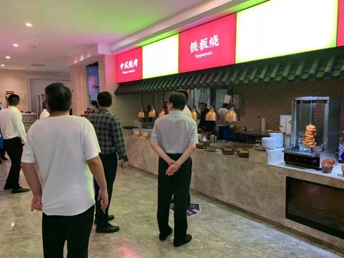 随后,在蓝海钧华大酒店经理赵鹏陪同下,刘岳一行参观了酒店自助餐厅和后厨,实地了解学生实习岗位和工作环境。刘岳对学生顶岗实习情况给予了高度评价,对蓝海钧华大酒店集团与我校合作的发展表示高度认同。