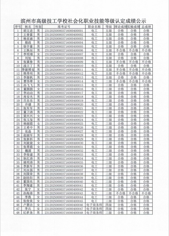 滨州市高级技工学校12月2日社会化职业技能等级认定(第四批)成绩公示