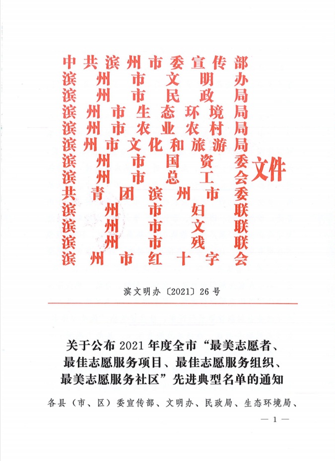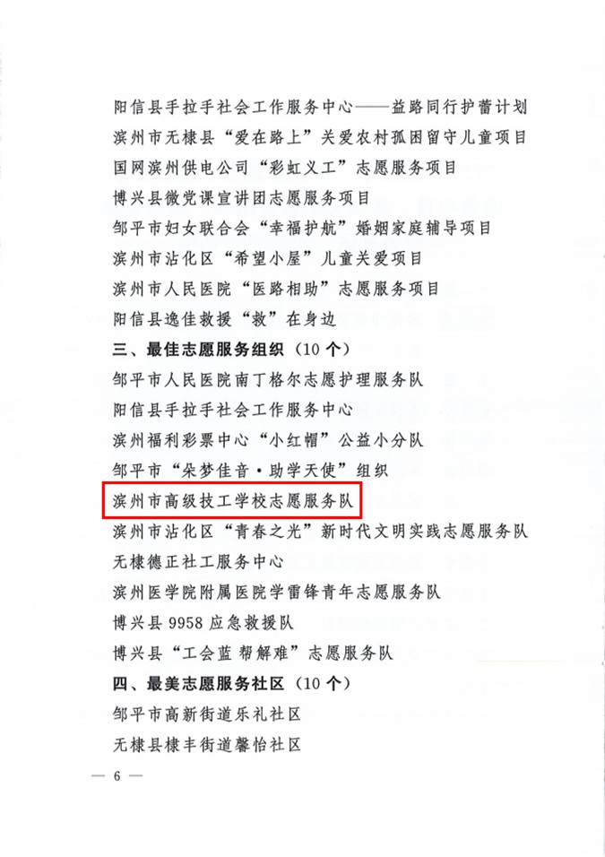 12月13日,中共滨州市委宣传部、滨州市文明办等部门联合印发《关于公布2021年度全市“最美志愿者、最佳志愿服务项目、最佳志愿服务组织、最美志愿服务社区”先进典型名单的通知》,滨州市高级技工学校志愿服务队被评为全市最佳志愿服务组织。