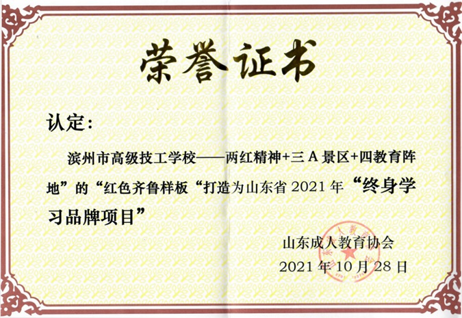 近日,山东省教育科学研究院成人教育协会发布2021年山东省“百姓学习之星” “终身学习品牌项目”评审结果。依据山东省教育厅《关于征集山东省“百姓学习之星”“终身学习品牌项目”和推荐全国“百姓学习之星”“终身学习品牌项目”的通知》要求,经专家评审,滨州市高级技工学校(滨州市中等职业学校)报送的《两红精神+三A景区+四教育阵地的“红色齐鲁样板”打造》被认定为山东省2021年“终身学习品牌项目”。