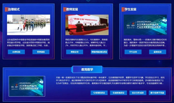 博览会线上展设置“云展馆、云场景、云视界、云服务、云学会、云学校、云风采、云互动”等八个版块,展示新技术应用场景,展示数字化转型整体驱动生产方式、生活方式、治理方式变革成果,展示职业教育高质量发展成果等。滨州市高级技工学校因“红色教育”特色鲜明,成果突出,被推荐参展首届世界职业教育产教融合博览会,是全国参展的30个中职学校之一,荣登产教融合博览会云学校版块。