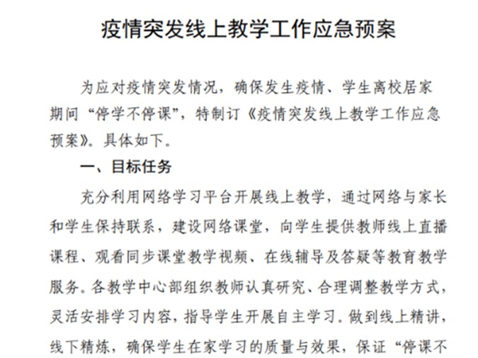 预案一经公布,各教学中心部迅速行动,积极组织各科教师开展线上、线下教研会,统一进度,筹备线上教学资料,交流经验,完善线上教学课程表。为了给学生营造上课气氛,老师们选择在教室上网课,提前在教室调试设备。学校后勤保障部门迅速摸排各教室、办公室的硬件设备和网络运行情况,为线上教学的顺利开展做好充足的保障。随着疫情形势进一步严峻,所有教师改为居家教学,但大家一如既往地保持高昂的教学激情,保证线上线下同质同效。