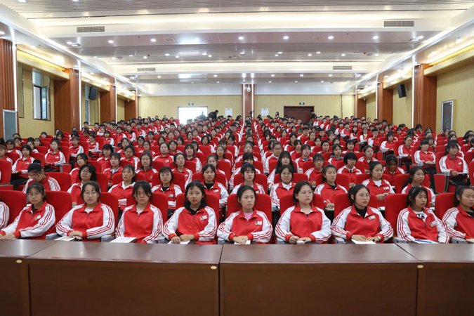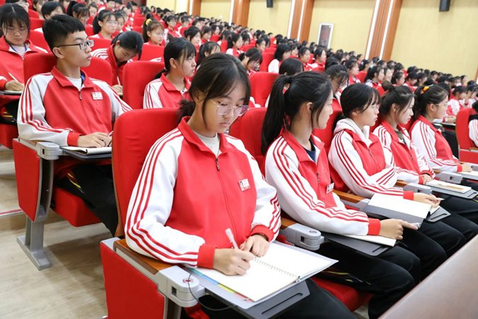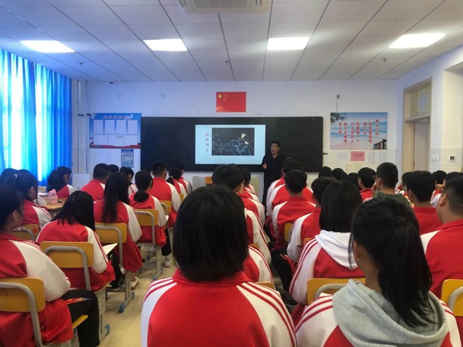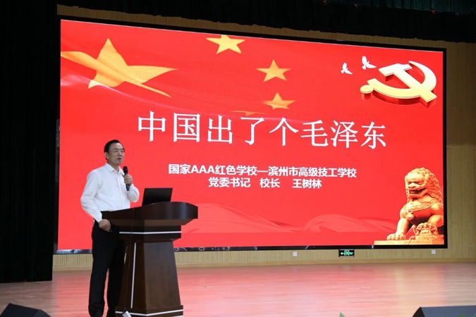 10月12日下午,滨州市高级技工学校可容纳近400人的北平楼报告厅座无虚席,党委书记、校长王树林正在为新生讲授红色思政课。